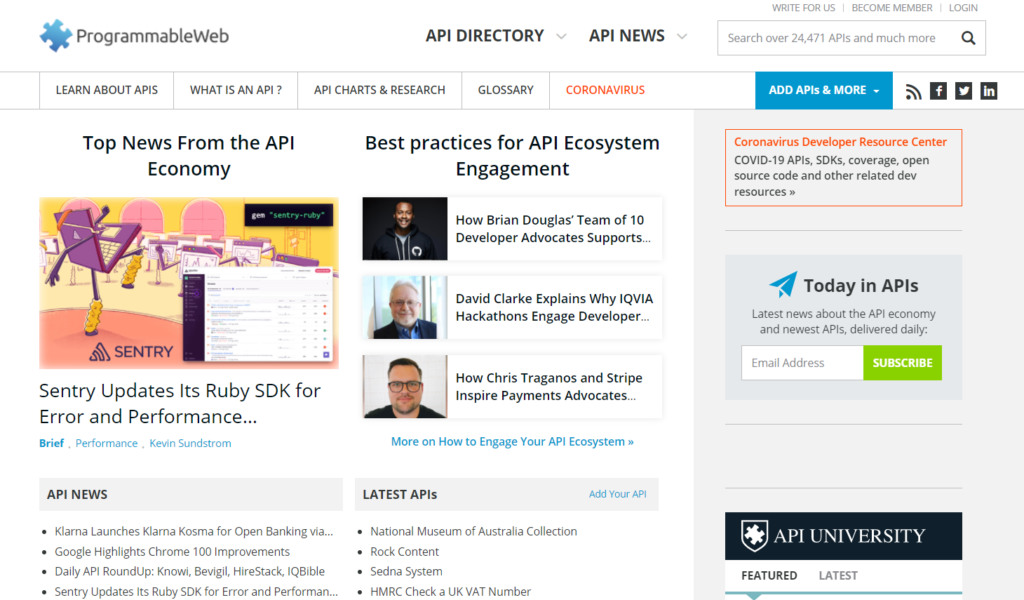 En førende kilde til API-nyheder og -information, der sporer udviklingen af dette felt rundt om i verden og leverer internettets API-katalog.