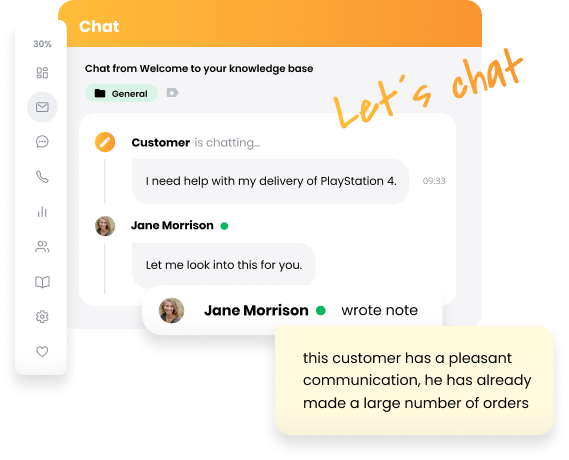 Help desk-systemet giver dine kolleger mulighed for at samarbejde på flere måder. Kundeserviceteamet kan kommunikere lige inde i kundesupportbilletterne og løse kundeproblemer meget hurtigt. Desuden kan kundeserviceteamet også chatte uden for helpdesk-billetterne. Effektivt teamwork vil tage din kundeservice til et professionelt niveau, hvilket vil resultere i tilfredse kunder.