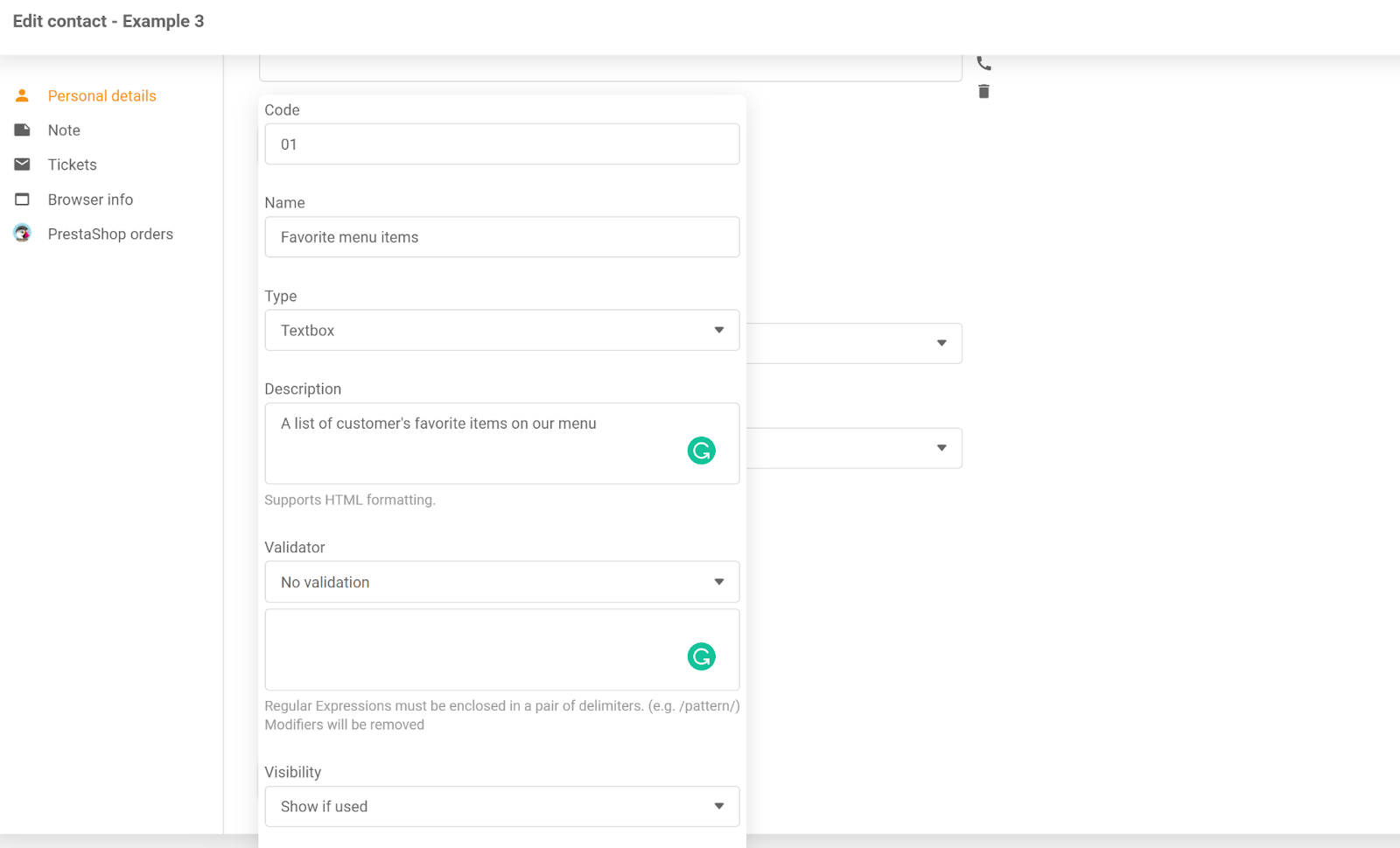 En af de bedste tilpasningsmuligheder for kontakter og virksomheder er brugerdefinerede felter. Denne funktion giver hver bruger mulighed for at tilpasse deres kontaktoplysninger derefter. Du kan tilføje en række brugerdefinerede felter, navngive dem og udfylde de oplysninger, du har brug for. Denne funktion er nyttig for enhver slags virksomhed, fordi den giver dig mulighed for at segmentere dine kunder i henhold til kriterier, du selv har valgt. Uanset om det er en type generel information som landedata eller kundens skostørrelse, kan du gemme det i kontaktoplysningerne. Du kan tilpasse feltet til at fungere som afkrydsningsfelt, tekstfelt, liste og mere. LiveAgent giver dig også mulighed for at indstille synligheden af disse data.