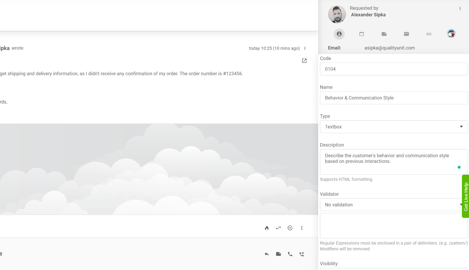Som du kan se på billetskærmbilledet ovenfor, kan du se alle data lige hvor du har brug for det, hvilket er et godt designvalg. Det bedste er, at du kan tilføje nye data, som du finder passende uden at gå ud af billetten. Dette kan hjælpe dig med at spare betydelig tid, samt kæmpe mod glemsomhed, som ofte er uundgåelig. Når du klikker på Tilføj felt, kan du tilføje brugerdefinerede felter, ligesom du ville gøre i Kundekontaktsektionerne i LiveAgent-indstillinger.
