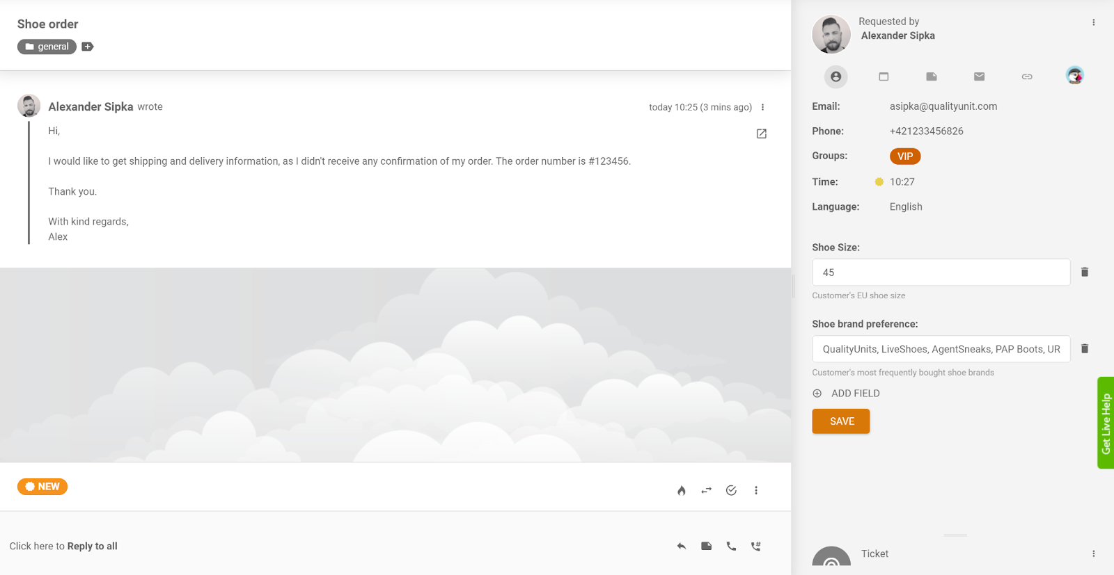 Customer relationship management funktionerne fungerer meget fint i LiveAgent. Når du modtager en billet fra en kunde, kan du se alle nødvendige oplysninger i højre panel i billetgrænsefladen. Det inkluderer alle tidligere gemte data, så du kan justere dine svar i overensstemmelse hermed. Da datafelterne kan tilpasses, er de lige så nyttige, som du gør dem til. Dette giver dig også mulighed for løbende at indsamle ny vital information fra interaktioner med dine kunder. Du behøver ikke engang at gå ud af billetten for at gøre det.