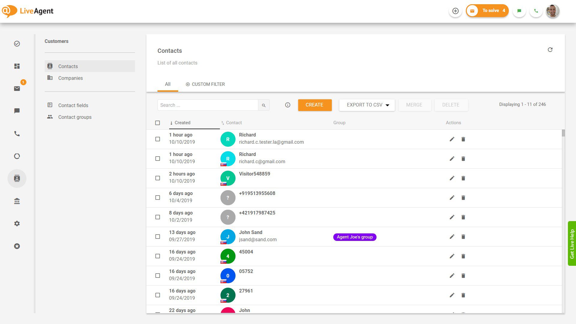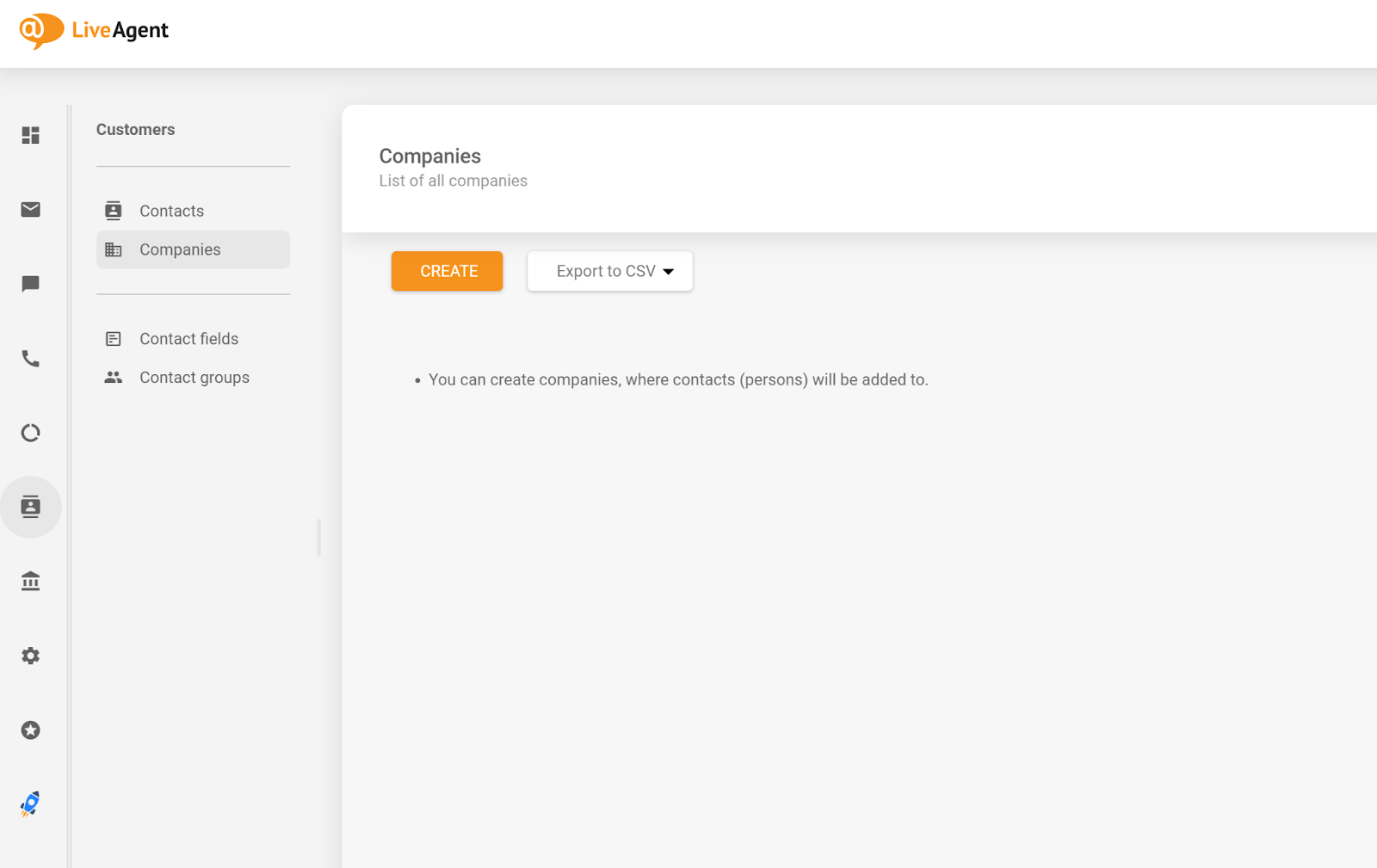 LiveAgent-grænsefladen er meget godt designet og forbedres ved hver opdatering. Du har alle de vigtigste værktøjer på venstre side, og størstedelen af grænsefladen er fokuseret på den foreliggende opgave, hvilket betyder færre forstyrrelser. Du kan få adgang til sektionen Customers her, hvor de fleste af LiveAgents CRM-funktioner opbevares.