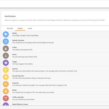 Når du har konfigureret alle tre gamification-funktioner i henhold til dine præferencer, vil systemet i LiveAgent begynde at spore nødvendige data i henhold til kriterierne. Når en agent opfylder visse betingelser, stiger de i niveau eller modtager badges. Denne proces er fuldstændig automatiseret, så du behøver ikke at gøre andet end opsætningen.