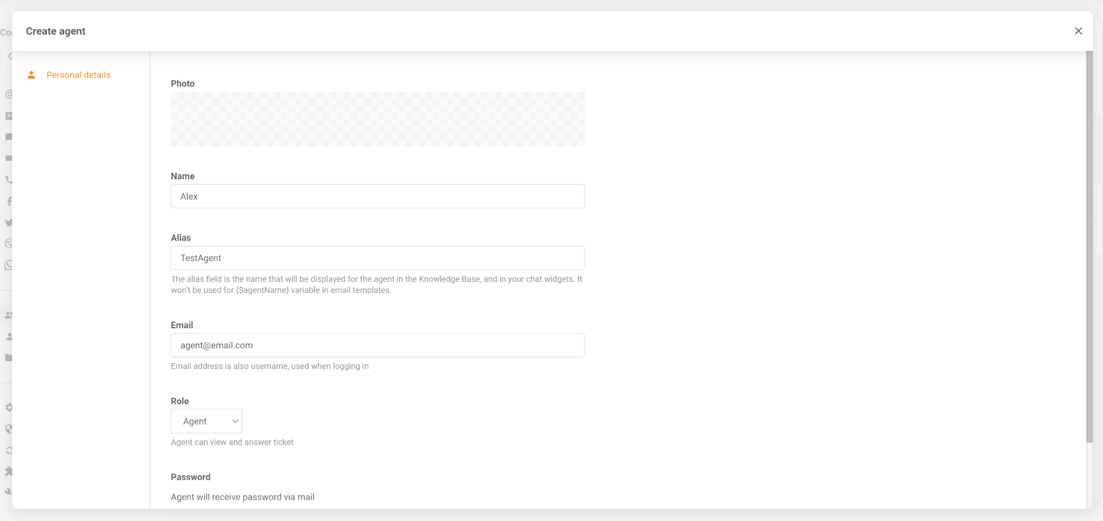 Det første du skal gøre, før du begynder at konfigurere gamification-funktionerne, er at tilføje nye agenter til LiveAgent-kontoen. Det kan du nemt gøre ved at bruge get started-guiden, som indeholder muligheden for at tilføje nye brugere. Alternativt kan du gå til Indstillinger og finde sektionen Agenter. Denne proces omfatter tilføjelse af agentens navn, profilbillede, alias, e-mail og agentrolle. Når du er færdig, sender LiveAgent en e-mail med loginoplysninger til den nye agents e-mailadresse.