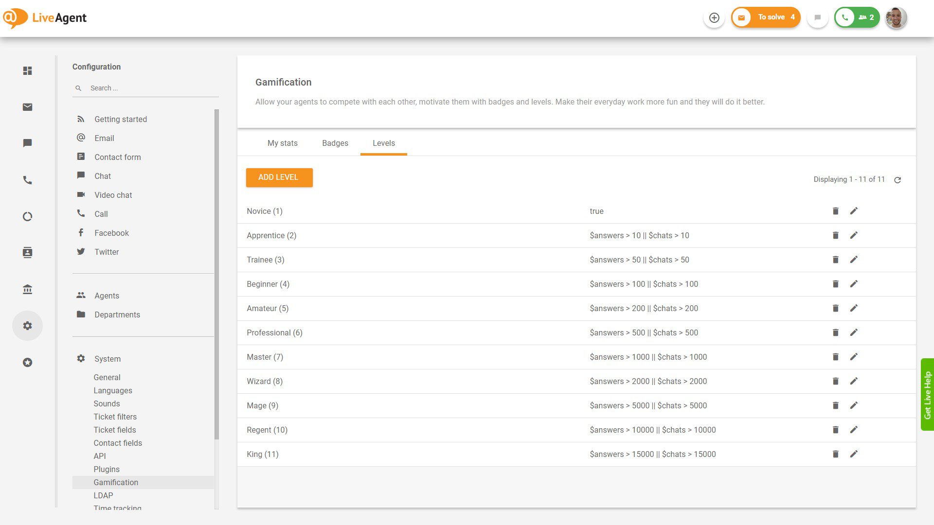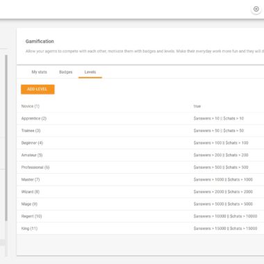 Niveauer i LiveAgent fungerer nøjagtigt som nivellering i rollespil. Hver agent vil stige til et højere niveau baseret på deres arbejdsindsats. Det bedste ved det er, at hver LiveAgent-kontoadministrator kan tilpasse niveauerne på enhver måde. Du kan omdøbe dem, vælge forskellige beskrivelser og indstille brugerdefinerede betingelser for at nå et bestemt niveau. Brugere kan være så kreative, som de vil, for at gøre niveaustigninger meget mere interessante for hver agent. For eksempel kan du lade dig inspirere af dit yndlings-RPG-spil.