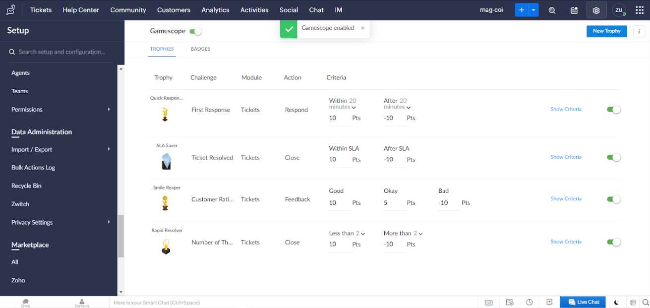 Udover badges kan du også introducere trophies. De belønnes på baggrund af at udføre forskellige supportopgaver. Det interessante ved denne funktion er, at du kan konfigurere trophies baseret på både positive og negative punkter. Mens førstnævnte flytter agenten mod at modtage en trophy, flytter sidstnævnte dem væk fra denne præstation. Dette er en sjov og konkurrencedygtig måde at holde dine agenter fokuserede og på toppen af deres spil hele tiden.